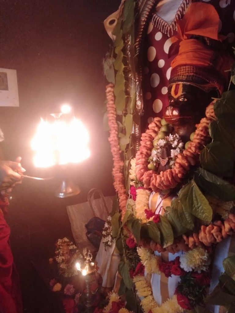 According to Hindu legends, Hanuman was born to mother Anjana and father Kesari. Hanuman is also called the son of the deity Vayu (Wind God) because of legends associated with Vayu’s role in Hanuman’s birth. One story mentioned in Eknath’s Bhavartha Ramayana (16th century CE) states that when Anjana was worshipping Vayu, the King Dasharatha of Ayodhya was also performing the ritual of Putrakameshti yagna in order to have children. As a result, he received some sacred pudding (payasam) to be shared by his three wives, leading to the births of Rama, Lakshmana, Bharata and Shatrughna. By divine ordinance, a kite snatched a fragment of that pudding and dropped it while flying over the forest where Anjana was engaged in worship. Vayu, the Hindu deity of the wind, delivered the falling pudding to the outstretched hands of Anjana, who consumed it, leading to the birth of Hanuman.